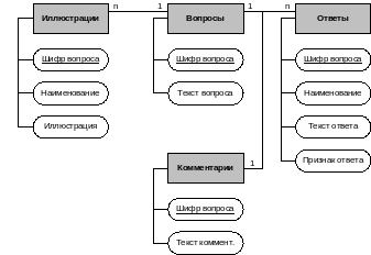 Подсистема конфигурирования предназначена для ввода и редактирования комплекта тестирования. Под комплектом тестирования будем понимать список вопросов, вариантов ответов, комментарии и иллюстрации к вопросам. Эта информация хранится в базе данных. Структура данных изображена на рис. 2.2.