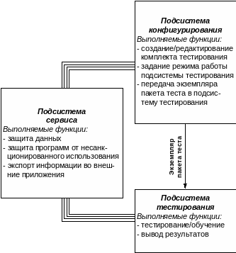Подсистема выполняет тестирование знаний экзаменуемого. Для проведения тестирования подсистема использует данные, полученные от подсистемы конфигурирования. Физически, подсистема тестирования может находиться на удалённом компьютере. Данные могут передаваться через канал связи или на магнитном носителе. На вход подсистемы передаётся база данных вопросов и их компонентами, а также информация о настройках теста. Подсистема тестирования производит выборку вопросов и загружает их в динамическую память. После этого производит настройку элементов пользовательского интерфейса в соответствии с выбранным режимом работы. Возможны 2 режима работы: