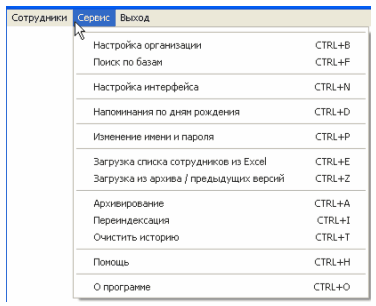 При выборе пункта сотрудники в главном меню, загружается журнал сотрудников. Меню для управление журналом состоит из следующих пунктов: