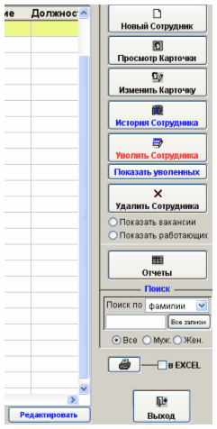 – поиск. Осуществляет поиск по базе данных. Есть возможность установить фильтры поиска: по фамилии, имени, отчеству, табельному номеру, структурному подразделению, должности, телефону, ИНН, улице, полу сотрудника;