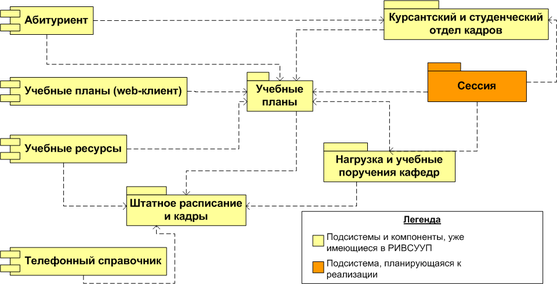 На рис. 2 показана схема подсистем и компонентов РИВСУУП и указано, какое место в этой иерархии занимает подсистема «Сессия» в ней: