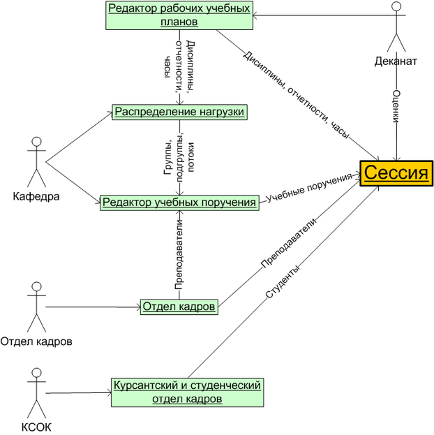 Сессия и учебные планы. Включает работу с учебными планами, поддерживает механизм контроля сроков сдачи сессии и хранение истории оценок, автоматическое определение академической задолженности, а также ввод, корректировку и хранение всей информации, необходимой работникам деканата в период проведения экзаменационной сессии. Осуществляет печать всех необходимых выпускных документов, в том числе массовую.