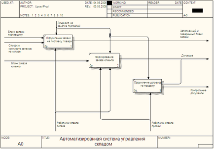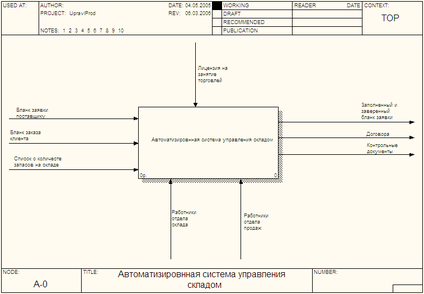 Как видно из контекстной диаграммы (рисунок 2), управляющая информация входит в блок сверху (Лицензия на занятие торговлей), в то время как входная информация (Бланк заявки поставщику, Бланк заказа клиента, Список о количестве запасов на складе), которая подвергается обработке, показана с левой стороны блока, а результаты (выход) показаны с правой стороны блока (Заполненный и заверенный бланк заявки, Договора, контрольные документы). Механизм (Работники отдела склада, Работники отдела продаж), который осуществляет операцию, предоставляется дугой, входящий в блок снизу.