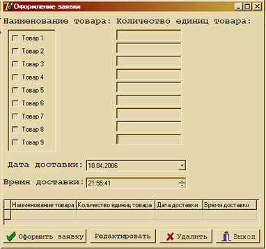 В «Наименование товара» галочкой помечаем те товары, которые хотим включить в заявку, а в «Количество единиц товара» вручную цифрами прописываем то количество товара, которое нам необходимо. После этого согласовываем дату и время доставки товара и заполняем все оставшиеся поля. Заполнив все поля нажимает кнопку «Оформить заявку» и завершаем работу с поставщиками.