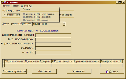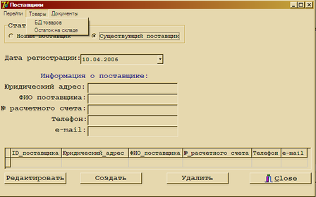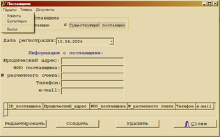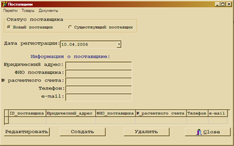 Возвращаясь к нашей главной форме можно начать работу с поставщиками. Предполагается, что кнопка «Поставщики» предназначена для работников Склада, в обязанности которых входит следующее: