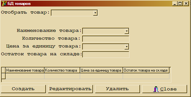 Также на главной форме имеется кнопка «БД товаров». Зайдя на нее можно получить полные сведения о все товарах. Которые имеются в наличии. По нажатию на эту кнопку появляется окно: