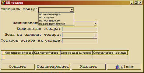 Здесь мы можем произвести отбор товара по тому признаку, который нас интересует. Это облегчает работу при поиске нужного товара. Мы можем отобрать товар по номенклатуре, по складам, по поставщикам, по дате поступления. Такой способ отбора позволяет сузить поиск и получить наиболее достоверную информацию за меньшее количество времени.