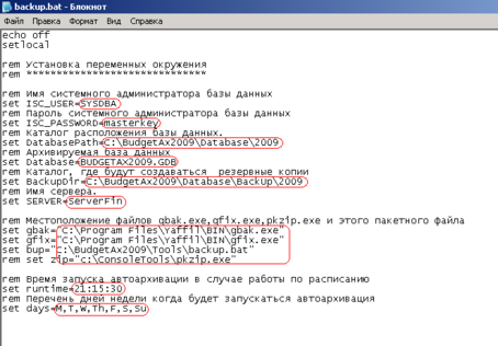 Кроме того, в инструментах АИС имеется командный файл Backup.bat MS DOS, предназначенный для ежедневного автосохранения резервной копии базы данных, архивирования и переиндексации, а также (при желании) ее восстановления на прежнее место расположения (с оптимизацией содержимого базы данных).