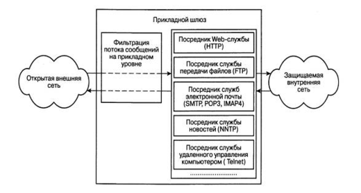Для каждого обсуживаемого протокола прикладного уровня можно вводить программных посредников – HTTP-посредник, FTP-посредник и т.д. Посредник каждой службы TCP/IP ориентирован на обработку сообщений и выполнение функций защиты, относящихся именно к этой службе. Также, как и шлюз сеансового уровня, прикладной шлюз перехватывает с помощью соответствующих экранирующих агентов входящие и сходящие пакеты, копирует и перенаправляет информацию через шлюз, и функционирует в качестве сервера-посредника, исключая прямые соединения между внутренней и внешней сетью. Однако, посредники, используемые прикладным шлюзом, имеют важные отличия от канальных посредников шлюзов сеансового уровня. Во-первых, посредники прикладного шлюза связаны с конкретными приложениями программными серверами), а во-вторых, они могут фильтровать поток сообщений на прикладном уровне модели МВОС.