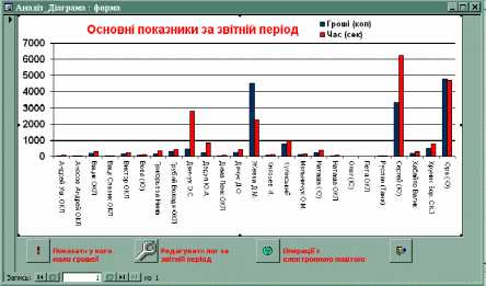 На формі зображена статистика використання комплексу його абонентами. Червоним кольором відображено час розмови (сек), синім кольором показано (кількість грошей (коп)), що використані при розмовах через комплекс за звітній період.