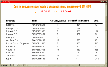 Третя форма реалізує систему звітів, які необхідні при представлені рахунку за розмови користувачам комплексу.