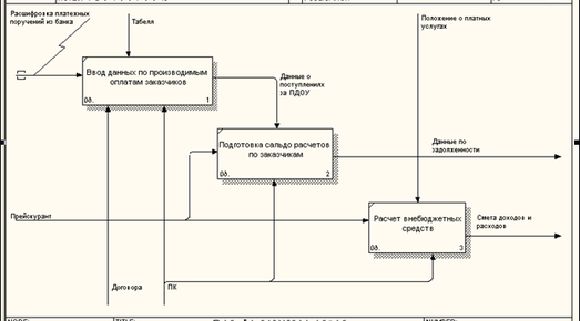 На основании заключенных договоров и табелей посещаемости просчитывается фактическая (за вычетом пропусков по уважительной причине) сумма к уплате за ПДОУ. Вводятся данные по произведенным оплатам, полученные из УУООУ. Которые в свою очередь поступают из банков, где производится оплата. На основании этих данных идет подготовка сальдо расчетов, т.е. сумма к уплате (переплата) по каждому ученику. После всех операций можно произвести расчет внебюджетных средств.