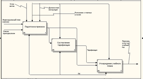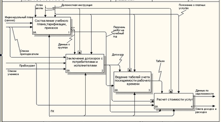 На основании полученных заявок специалист составляет учебный план, согласованный с руководством, а также составляет и утверждает тарификацию. После полученных данных о группах и перечне предметов заключаются договора с потребителями и исполнителями. По предоставляемым услугам ведутся табеля учета рабочего времени и табелей учета посещаемости детей. По табелям рассчитывается стоимость услуг по каждому потребителю.