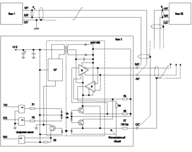 Формирователи и приемники, соответствующие требованиям стандарта EIA RS-485, сохраняют работоспособность при воздействии на них синфазного напряжения в диапазоне от минус 7 до плюс 7 В (мгновенное значение). Синфазное напряжение определяется совокупностью нескомпенсированных разностей потенциалов земли приемников и формирователей, максимальным значением напряжения помех, измеренного между землей приемника и жилами кабеля, соединенными с землей на передающей стороне линии связи, а также максимальным значением напряжения смещения выходов формирователей (Uos). Если значение разности потенциалов между землями выходит за пределы допустимого диапазона, то при реализации сети на основе интерфейса RS-485 следует применять приемопередатчики с гальванической изоляцией. Один из возможных способов объединения формирователей и приемников с гальванической изоляцией показан на рис. 5.1.