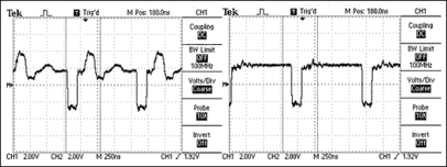 Рис. 3.5. Используя схему, показанную на верхнем рисунке, сигнал слева был получен с MAX3485, нагруженным на 120-омную витую пару, и 54-омным согласующим резистором. Сигнал справа был получен при корректном согласовании с помощью 120-омного резистора.