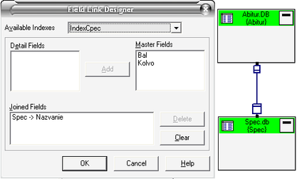 Поле Nazvanie в таблице Abitur ключевое. В нём хранятся данные о названиях специальностей. В поле Spec в таблице Abitur хранятся данные о специальности, на которую поступает конкретный абитуриент.
