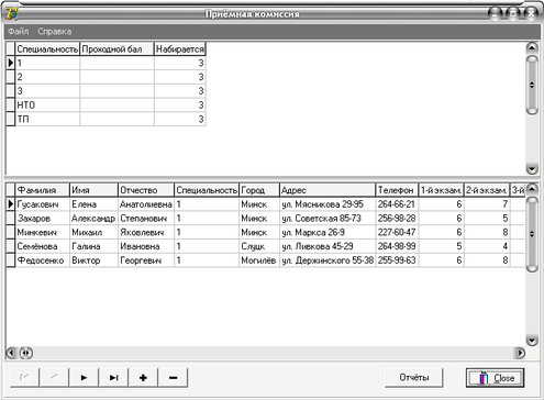 Программа предназначена для учёта абитуриентов в средних специальных учебных заведениях с тремя вступительными экзаменами и общепринятым набором приёма документов (аттестат (диплом), мед. справка, справка о семейном положении, фото).