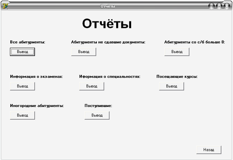 При нажатии на кнопку отчёты появляется окно программы «Отчёты» (Рис 3.2), предназначенное для вывода отчётов.