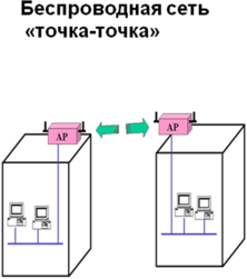 В пункте 3.1.2 были рассмотрены основные типы архитектуры и режимы работы беспроводных сетей. Для решения поставленных задач целесообразно применить одноранговую архитектуры взаимодействия элементов сети и использовать режим работы мост «точка – точка» (Bridge). Такая архитектура продемонстрирована на рисунке 3.4.