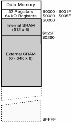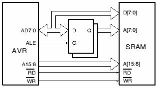 Внутрішній ОЗП мікроконтроллеру розташований за адресою 0060h та закінчується 025Fh. Починаючи з адреси 0260h до FFFFh можна адресувати зовнішню пам’ять. На рис. 3 надана структурна схема підключення зовнішнього ОЗП до мікроконтроллеру.