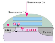 | Рис.4 Запись[3] | Запись При программировании на сток и управляющий затвор подаётся высокое напряжение (причём на управляющий затвор напряжение подаётся приблизительно в два раза выше). "Горячие" электроны из канала инжектируются на плавающий затвор и изменяют вольтамперные характеристики транзистора. Такие электроны называют "горячими" за то, что обладают высокой энергией, достаточной для преодоления потенциального барьера, создаваемого тонкой плёнкой диэлектрика. |