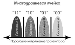 Ячейки флеш-памяти существуют как на одном, так и на двух транзисторах. В простейшем случае каждая ячейка хранит один бит информации и состоит из одного полевого транзистора со специальной электрически изолированной областью ("плавающим" затвором - floating gate), способной хранить заряд многие годы. Наличие или отсутствие заряда кодирует один бит информации. При записи заряд помещается на плавающий затвор одним из двух способов (зависит от типа ячейки): методом инжекции "горячих" электронов или методом туннелирования электронов. Стирание содержимого ячейки (снятие заряда с "плавающего" затвора) производится методом тунеллирования. Как правило, наличие заряда на транзисторе понимается как логический "0", а его отсутствие - как логическая "1". Современная флеш-память изготавливается по 30-нм технологическому процессу. Принцип чтения микросхемы Flash довольно прост и базируется на законах квантовой механики. При извлечении данных из памяти, заряд на “плавающем” затворе отсутствует, а на управляющий затвор подается заряд положительного направления. Под его воздействием между стоком и истоком создается канал трассировки (свободная зона на кристалле транзистора, выделенная для реализации межсоединений ячеек). Все это происходит за счет туннельного эффекта, а данные памяти затем можно считывать с истока. Если на “плавающем” затворе имеется заряд, то обычного напряжения (которое подается при чтении) недостаточно. Поэтому при записи применяют метод инжекции электронов. Суть его заключается в следующем: на управляющий затвор и исток подается высокое напряжение (причем на затворе оно в два раза выше). Благодаря этому напряжению, электроны способны преодолеть тонкую пленку диэлектрика и попасть на “плавающий” затвор. Такой процесс получил название “инжекция горячих электронов” (термин “горячий” условен, электроны были названы так, потому что обладают высокой энергией, достаточной для преодоления диэлектрика). Чтобы стереть информацию из памяти, достаточно подать высокое положительное напряжение на исток. Под его воздействием отрицательные электроны с “плавающего” затвора (благодаря туннельному эффекту) переходят в область истока. Процесс продолжается до полной разрядки затвора. Ускорить метод туннелирования электронов можно путем подачи дополнительного высокого отрицательного напряжения на управляющий затвор. Эффект туннелирования - один из эффектов, использующих волновые свойства электрона. Сам эффект заключается в преодолении электроном потенциального барьера малой "толщины". Для наглядности представим себе структуру, состоящую из двух проводящих областей, разделенных тонким слоем диэлектрика (обеднённая область). Преодолеть этот слой обычным способом электрон не может - не хватает энергии. Но при создании определённых условий (соответствующее напряжение и т.п.) электрон проскакивает слой диэлектрика (туннелирует сквозь него), создавая ток. Важно отметить, что при туннелировании электрон оказывается "по другую сторону", не проходя через диэлектрик. При этом электроны с “плавающего” затвора будут отталкиваться в сторону диэлектрика, а время эффекта значительно уменьшится. Мы рассмотрели простейший случай, когда каждая ячейка Flash хранит один бит информации и состоит из одного полевого транзистора. Перезапись и 
