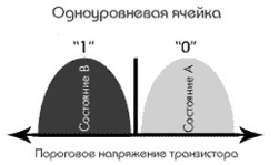 Рассмотрим простейшую ячейку флеш-памяти на одном n-p-n транзисторе. Ячейки подобного типа чаще всего применялись во flash-памяти с NOR архитектурой, а также в микросхемах EPROM. Поведение транзистора зависит от количества электронов на "плавающем" затворе. "Плавающий" затвор играет ту же роль, что и конденсатор в DRAM, т. е. хранит запрограммированное значение.[3]