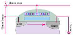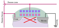 | Чтение при наличии заряда Наличие заряда на "плавающем" затворе меняет вольтамперные характеристики транзистора таким образом, что при обычном для чтения напряжении канал не появляется, и тока между истоком и стоком не возникает. | Рис.3 Чтение при отсутствии заряда[3] |