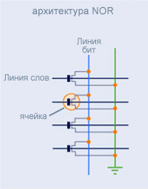 Название NOR ведет свою родословную от логической операции Not OR (не «или»): если хотя бы один из транзисторов, подключенных к линии битов, включен, то считывается "0". NOR-Ячейки работают сходным с EPROM способом. Каждый транзистор-ячейка подключен к трем линиям: Word Line (линия слов), Select Line (линия выборки) и Bit Line (линия бит). Выборка осуществляется путем подачи высокого напряжения на Word Line, подключенную к затвору, и наблюдения за разницей потенциалов между Select Line (исток) и Bit Line (сток). Если на плавающем затворе находилось достаточное количество электронов, то их отрицательное поле препятствовало протеканию тока между истоком и стоком и напряжение оставалось высоким. Такое состояние полагается в терминах флеш-памяти нулем, в противоположном случае считывается единица.