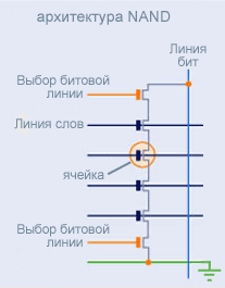 NAND является более выгодным, с точки зрения экономии пространства, способом организации ячеек. Транзисторы подключаются к битовым линиям группами, то есть последовательно. Если все транзисторы группы открыты, включены, Bit Line заземляется, напряжение между ней и Word Line падает до нуля: срабатывает логика Not AND (не «и») - если все элементы равны 1, то выдается 0. Правда, считывание затруднено вследствие падения напряжения на гирлянде транзисторов, однако скорость обращения повышается за счет адресации сразу целой группы битов. При произвольном доступе достоинство превращается в недостаток, и NAND-чипы обычно отличаются от NOR наличием дополнительного внутреннего кэша. Учитывая всё вышесказанное, NAND-память представляет собой наиболее подходящий тип памяти для устройств, ориентированных на блочный обмен: MP3 плееров, цифровых камер и в качестве заменителя жёстких дисков.[5]