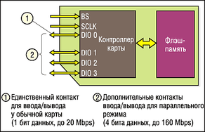 Стандарт был разработан в 1995 г. компанией Toshiba, а его продвижением занимается организация SSFDC Forum, в рядах которой немало известных компаний. Кстати, SSFDC (Solid State Floppy Disk Card) можно перевести как "твердотельная дискета". Следует отметить, что многие производители делают флеш-карты сразу трех основных типов: Compact Flash, SmartMedia и MultiMediaCard. В отличие от Compact Flash, карты SmartMedia (SM) не снабжены встроенным контроллером, что, по замыслу создателей, должно снижать их стоимость. Кроме того, SМ имеют меньшие размеры (37x45x0,76 мм) и массу (до 2 г). По популярности SM спорят с CF, а вместе с ним оба этих стандарта охватывают более половины рынка флеш-карт. Рабочие напряжения у SM такие же, как и у CF, но обычно используется 3,3 В. Максимальная емкость карт, объявленная производителями, в частности компаниями EMTEC и Delkin, составляет 128 Мбайт. Из-за отсутствия внутреннего контроллера для работы с этими картами невозможно применить пассивный переходник, а считыватели для них стоят около 50 долл. К сожалению, SМ не дешевле, чем CF.