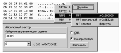 Для этого щелкните на кнопке Перейти и в открывшемся меню (рис. 22) выберите команду NTFS ► MFT. Обратите внимание, что здесь же указан номер сектора (относительно начала раздела), с которого начинается MFT.