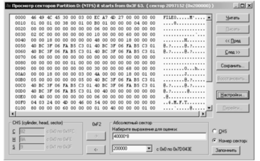Рис. 21. Поиск первого сектора MFT с помощью утилиты Просмотр секторов