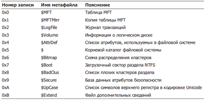 Таблица 2. Последовательность размещения записей метафайлов в файле $MFT[13]
