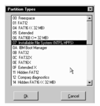 Если вы знаете, что восстанавливаемый NTFS-раздел находится на прежнем месте, но в соответствующей ему строке указан неверный тип раздела, вы можете попробовать установить корректное значение принудительно. Для этого щелкните на кнопке Set Туре (установить тип) и в открывшемся окне выберите требуемое значение (рис. 7.19). Для раздела NTFS оно равно 07h. Если вам известны корректные значения других параметров раздела и они отличаются от представленных в таблице, вы можете (предварительно запомнив или записав на бумаге текущие значения) ввести их в поля таблицы. Чтобы внесенные изменения были записаны на диск, щелкните на кнопке Save Change (Сохранить изменения)