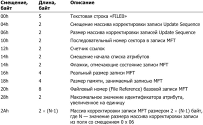 Таблица 3. Формат заголовка записи MFT[13]
