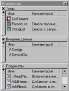 Окно инспектора разбито на три части: "Типы", "Внешние данные" и "Предикаты". В случае надобности разделы "Типы" и "Внешние данные" можно временно свернуть, нажав на верхнюю кнопку соответствующей панели.