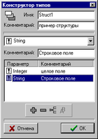 Для добавления элемента в список типов необходимо нажать на кнопку с изображением плюса. Тогда справа от кнопки появится меню для выбора типа: "Список", "Структура", "Составной тип". Для каждого типа открывается окно конструктора типов, в котором можно редактировать составные элементы типов. При нажатии на кнопку "Ок" тип будет занесен в список типов. Для внесения нового элемента в тип необходимо выбрать его из списка, ввести комментарий (если необходимо) и нажать на кнопку плюс на нижней панели