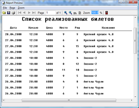 В разработанной системе «Информационно-справочная система кинотеатра» предусмотрено создание отчетов. По результатам выполнения запроса, который осуществляется посредством вызова формы «Продажа билетов» с помощью выбора даты или номера сеанса за который необходимо вывести список проданных билетов.