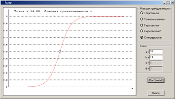 Для того чтобы определить значение данной функции распределения в конкретной точке, в класс CFuzzyDlg была добавлена функция обработки сообщения перемещения манипулятора «Мышь» WM_MOUSEMOVE ‑ CFuzzyDlg::OnMouseMove(UINT nFlags, CPoint point). При перемещении мыши выводится значение точки x (с учетом масштаба) и степень принадлежности (значение данной функции принадлежности) этой точки x.