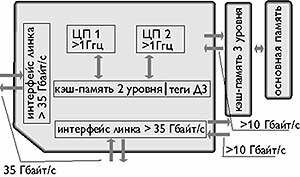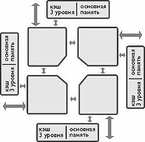 Отличительная особенность Power4 – наличие кэш-памяти второго уровня, разделяемой двумя процессорами кристалла, а также внешними процессорами других кристаллов через линки шириной 16 байт, работающие на тактовой частоте более 500 МГц, что обеспечивает пропускную способность свыше 8 Гбайт/с. Суммарная пропускная способность 4 линков составляет более 35 Гбайт/с. При объединении 4 кристаллов и их размещении, как показано на рис. 3.5, проводники линков могут быть достаточно короткими и, что важно, прямыми.