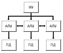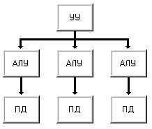 Если в машине I увеличить число пар арифметико-логическое устройство память данных (иногда эту пару называют процессорным элементом) то получим машину IV (рис. 1.8). Единственное устройство управления выдает команду за командой сразу всем процессорным элементам. С одной стороны, отсутствие соединений между процессорными элементами делает дальнейшее наращивание их числа относительно простым, но с другой, сильно ограничивает применимость машин этого класса. Такую структуру имеет вычислительная система PEPE, объединяющая 288 процессорных элементов.