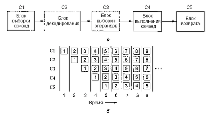 На рис. 2.3а изображен конвейер из 5 блоков, которые называются стадиями. Стадия С1 вызывает команду из памяти и помещает ее в буфер, где она хранится до тех пор, пока не будет нужна. Стадия С2 декодирует эту команду, определяя ее тип и тип операндов, над которыми она будет производить определенные действия. Стадия СЗ определяет местонахождение операндов и вызывает их или из регистров, или из памяти. Стадия С4 выполняет команду, обычно путем провода операндов через тракт данных. И наконец, стадия С5 записывает результат обратно в нужный регистр.