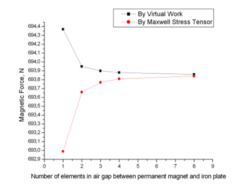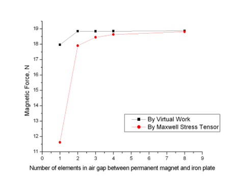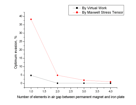 Важно отметить, что точность вычислений силы магнитного поля на ферромагнитное основание зависит от числа элементов по длине воздушного зазора, и от самой длины воздушного зозора. В этом месте модели происходят скачки свойств материалов: постоянный магнит – воздух – ферромагнитный материал. Чтобы получить погрешность мене 1% относительно последнего результата расчетов силы по тензору Максвелла, число элементов по кратчайшему расстоянию между магнитом и объектом, на который вычисляется сила, должно быть не менее четырех, а для метода виртуальной работы достаточно двух. Это справедливо для зазора, соизмеримого с размерами магнитной системы. Для минимального зазора, рассматриваемого в данной задаче, 0.1 мм, для метода расчетов силы по тензору Максвелла с погрешностью 1% достаточно двух элементов по длине воздушного слоя, для метода виртуальной работы достаточно и 1 элемента. Эти данные справедливы только для геометрии рассматриваемой модели, и их не рекомендуется обобщать на другие расчетные модели.