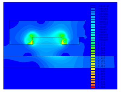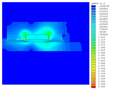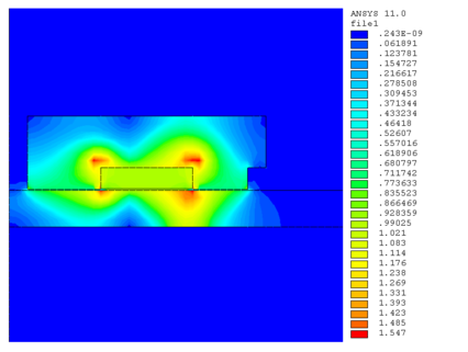 Рис.3.4 Распределение модуля вектора магнитной индукции, воздушный зазор 0,1 мм.