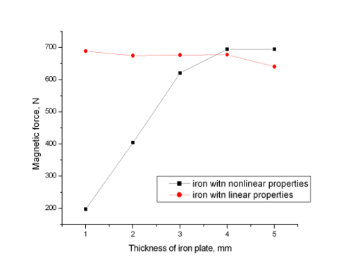 При вычислении удерживающей силы магнитного поля методами программной системы конечно-элементного анализа ANSYS можно использовать вместо кривой намагничивания материала среднее значение относительной магнитной проницаемости, если расчеты проводятся не в диапазоне насыщения материала. Это значительно упростит время расчетов и избавит от нелинейности в свойствах материала. Но для определения распределения магнитной индукции в рассматриваемом объекте такая замена недопустима.