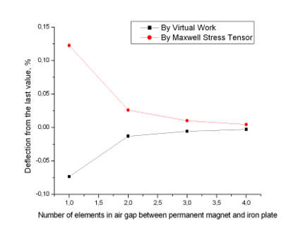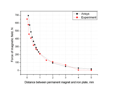 Магнитная пружина – демпфер, для нее было важно определить максимальную удерживающую силу. Используемые в системе магниты были малогабаритные, поэтому провести эксперимент не представляло трудности. Результаты эксперимента совпали с расчетными данными, поэтому можно использовать программный комплекс ANSYS для решения подобных задач. Также были рассмотрены различные конечно-элементные расчетные модели для сравнения полученных результатов и выбора оптимального варианта. Была исследована сходимость методов расчета программной системы конечно-элементного анализа ANSYS в зависимости от числа элементов модели.