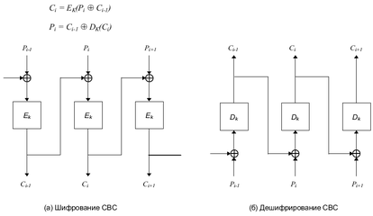 В режиме сцепления блоков шифра (cipher block chaining, CBC) перед шифрованием над открытым текстом и предыдущим блоком шифротекста выполняется операция XOR.