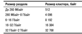 В табл. 15 приведен размер кластера при использовании FAT 32 с различными размерами разделов.