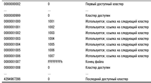 Основное преимущество FAT 32 — это возможность использования 32-разрядных записей, вместо 16-разрядных, что приводит к увеличению числа кластеров в разделе до 268 435 456 (вместо 65 536, или 216). Это значение эквивалентно 228, а не 232, поскольку четыре бита из 32 зарезервированы для других целей.